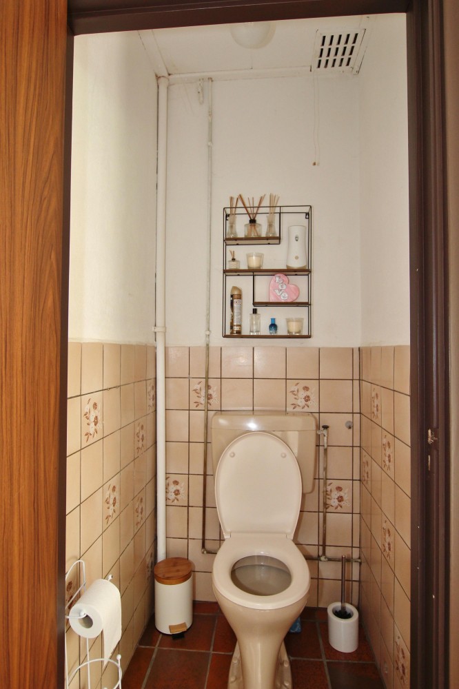 De badkamer (ca. 3,00 x 1,50 m) is uitgerust met een douchecabine, wastafelmeubel met spiegelkast en sanibroyeur.